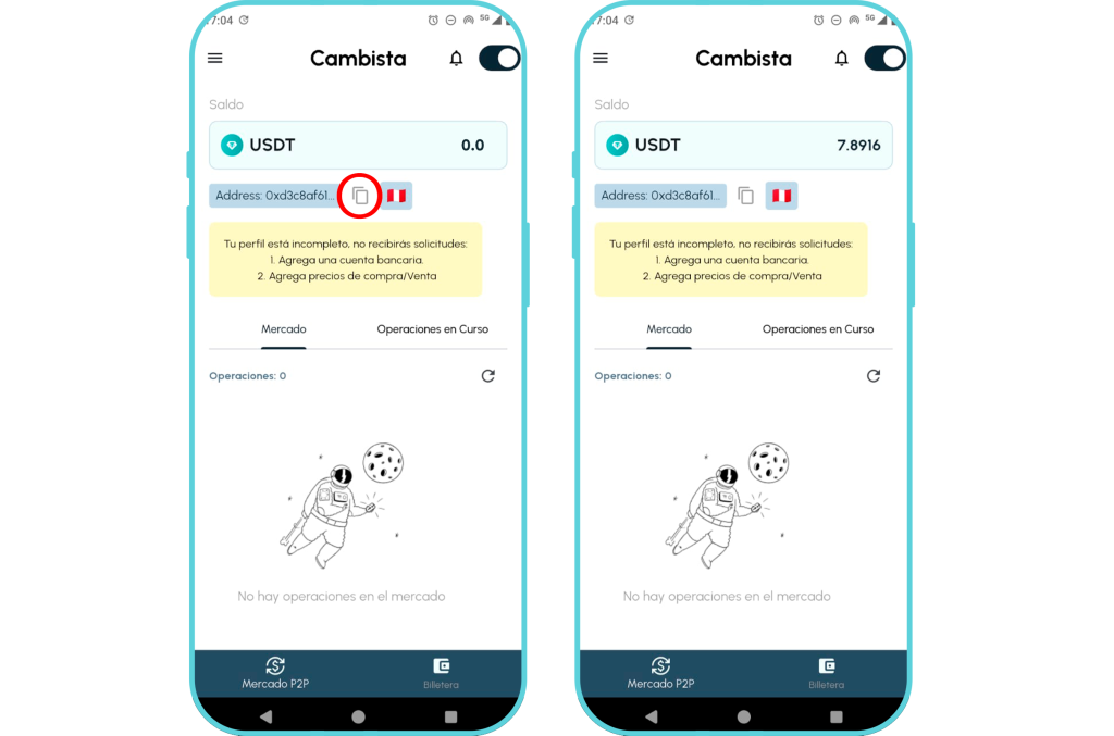 Debes recargar tu saldo de dólares digitales copiando la dirección de wallet de la App.